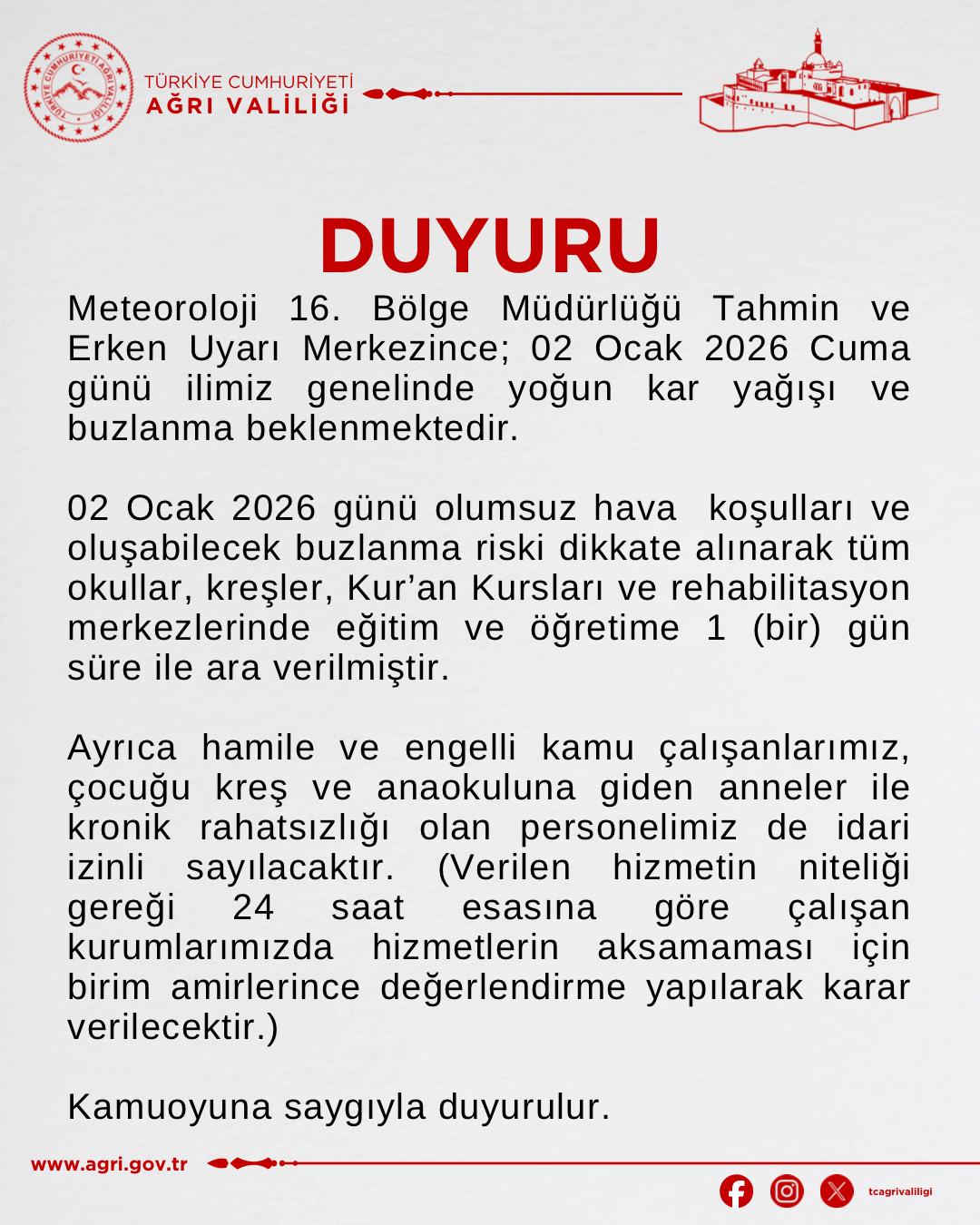 Ağrı genelinde etkili olması beklenen yoğun kar yağışı ve buzlanma nedeniyle eğitime 1 gün ara verildi. Meteoroloji 16. Bölge Müdürlüğü’nün uyarıları doğrultusunda Ağrı Valiliği tarafından alınan kararla, 2 Ocak 2026 Cuma günü il genelindeki tüm resmi ve özel okullar, kreşler, Kur’an kursları ve rehabilitasyon merkezlerinde eğitim-öğretim faaliyetleri durduruldu.