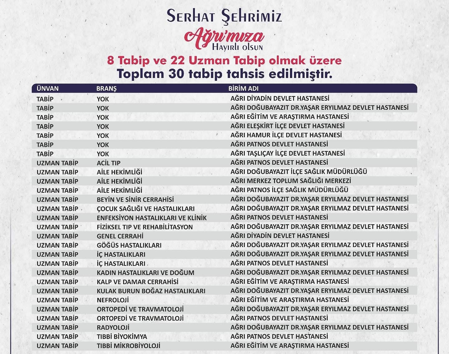 Ağrı’nın sağlık altyapısı önemli bir takviye ile daha da güçleniyor. Sağlık Bakanlığı tarafından yapılan yeni hekim atamaları kapsamında, Ağrı merkez ve ilçelerinde görevlendirilmek üzere 22 Uzman Tabip ve 8 Tabip olmak üzere toplam 30 yeni hekim kadrosu tahsis edildi.